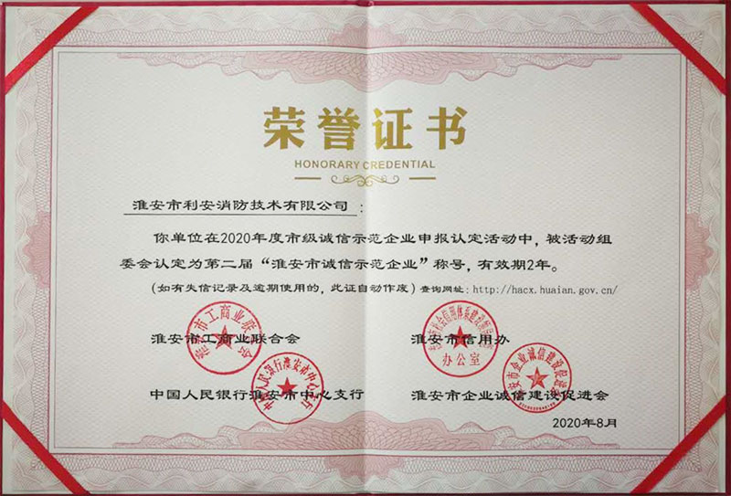 热烈祝贺淮安市利安消防技术有限公司荣获“淮安市第二届诚信示范企业“认定